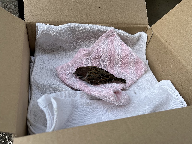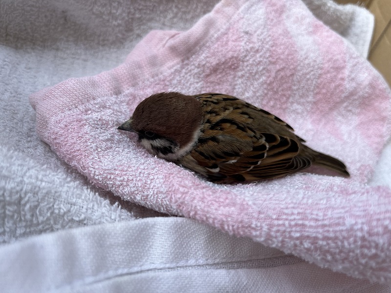2階から降りてスズメのもとに駆け寄ると、ほんわり暖かい。脳震盪を起こしてじっとしていますが、つぶらな目はパチパチしています。